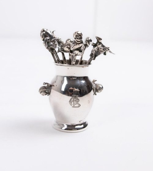 Aquest porta-pics de plata, acompanyat de 10 pics decorats amb petites figuretes, és un accessori elegant per a aperitius i recepcions. Cada pic finament elaborat us permet recollir aperitius amb estil, mentre que el suport central de plata els presenta d'una manera refinada. Els detalls dels cargols aporten un toc lúdic i sofisticat al conjunt, fent d'aquest conjunt un objecte tan pràctic com decoratiu per a taules distingides.