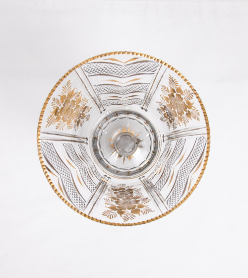 Bol de vidre decoratiu, elegant i refinat. Està decorat amb motius florals daurats, aplicats tant a la superfície principal com a la base. El vidre, finament treballat amb gravats en relleu, presenta dibuixos geomètrics que emmarquen els detalls florals, creant un interessant contrast entre l'or i la transparència del vidre. La vora superior, lleugerament festoneada, també es veu realçada amb una fina línia daurada, aportant un toc de sofisticació al conjunt. Aquest bol es pot utilitzar com a peça decorativa o per a ocasions especials.