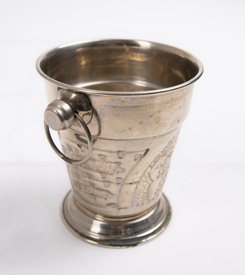 Elegante cubitera de metal plateado, ideal para tus recepciones. Su refinado diseño, completo con asas laterales, está realzado con un delicado patrón grabado que le da un toque de sofisticación. Perfecto para realzar tus momentos festivos, este cubo combina brillantemente estilo y funcionalidad.