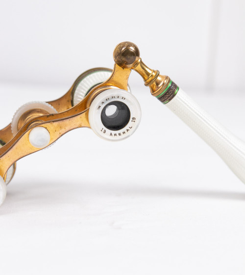 Estos elegantes binoculares de teatro de metal dorado y esmalte son un accesorio refinado, utilizado a menudo en el siglo XIX y principios del XX para asistir a espectáculos. El cuerpo de metal dorado está finamente decorado con detalles esmaltados, añadiendo un toque lujoso y artístico. Compactos y ligeros, permiten una visión clara y cercana del escenario, al tiempo que encarnan el estilo y el prestigio de las representaciones teatrales de la época.